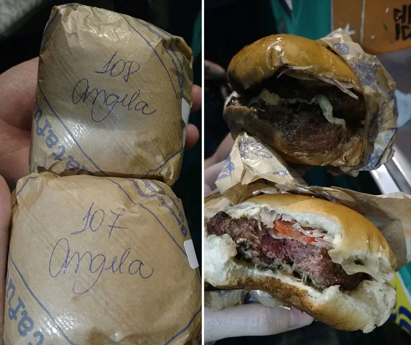 Um dos melhores hamburgueres que já comi na vida e olha…não consegui comer inteiro aheuahea São três opções: carne, calabresa ou vegetariano, todos com valor fixo de R$10! Queijo, tomate, cebola roxa e maionese dentro do pão com a carne (ou pseudocarne) a sua escolha embrulhados no papel. Também é possível pedir o duplo de carne (R$15) e adicionar bacon e cheddar.