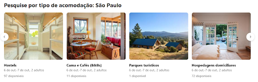 Seção do Booking “Pesquise por tipo de acomodação” em São Paulo, com cartão para escolher hostel